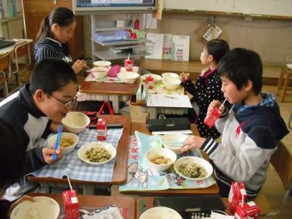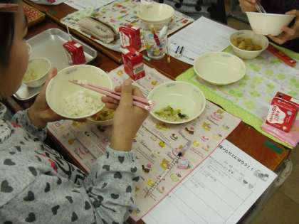 いつもは全然違う話をしながら給食を食べていた子どもたちですが,今日は「この肉じゃがは,味噌の味がする」「切り干し大根は,油揚げの香りがする」「麦ごはんはよくかんだら甘いなあ」等の会話をしていました。