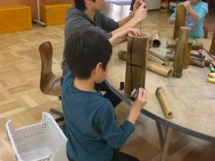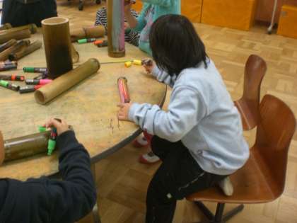例年、岡崎にある京都市立美術館で行わる、小さな巨匠展の作品つくりを、京都教育大学附属特別支援学校でしました。今年の伏見中支部は、みんなが楽しめる楽器つくりをすることになりました。そこで附属にたくさん生えている竹を利用することにしました。竹を適当な長さに切り、火であぶり、それにみんなで絵を描いてもらいました。後は、その竹を立て並べて、細い竹でたたいて音を鳴らそうというものです。後の組み立ては、付属でしてもらいますので、どんな仕上げになるか楽しみです。この作品は、本校の造形展でも展示予定です。