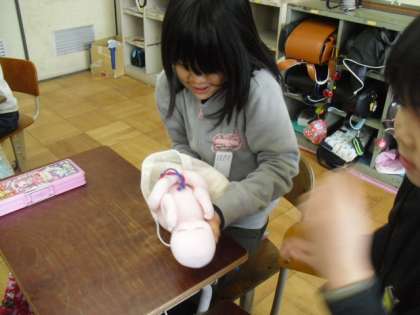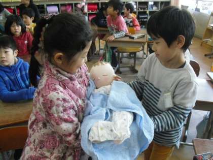 生まれた時の赤ちゃんの人形(約3kg)を一人ひとり抱っこする体験もしました。「意外と重い!」や「首がぐらぐらしているから頭を支えないと」という意見も聞かれました。