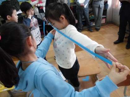 自分の両手を広げた長さをはかるために班で協力しながら,工夫して測っていました。