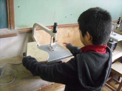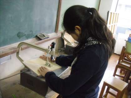 図工科ではセロテープカッターを作成しています。デザインに合わせて,電動のこぎりで板を切っていきます。はじめての電動のこぎりで,こわがって板がしっかり押さえられなかったり,はしゃぎすぎて無茶苦茶に切ってしまったりするのではないかとドキドキしていましたが,はじめてとは思えないほど,落ち着いてしっかりと作業することができました。