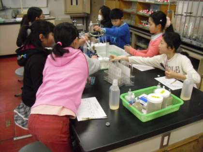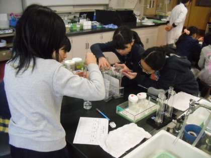 散策のあとは,いよいよ環境実験室学習の開始です。「水の汚れと自然の力」と「みてみてアルテミア」に分かれて学習します。グループで協力して,テキパキと準備をしていました。