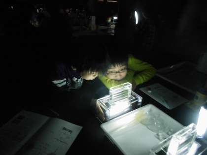 続いては,アルテミアの行動を調べていきました。真っ暗の中,光を当てるとアルテミアはどのような行動をするのでしょう。実際に調べてみると,腹を向けて泳ぐことが分かりました!