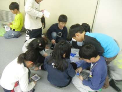 3時間目に,藤城小学校のみんなで集めたペットボトルキャップを使って,30周年の記念パネルをつくりました。一人一人,自分のパネルに書いてある色のキャップを見つけてはめ込んでいきます。色が似ているキャップや,はめにくいキャップがあって難しかったけど頑張りました。