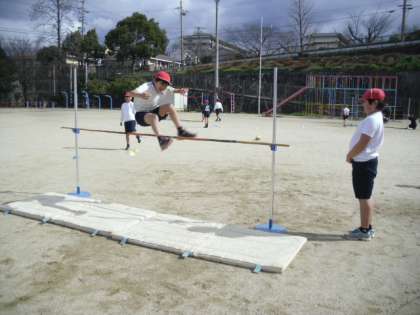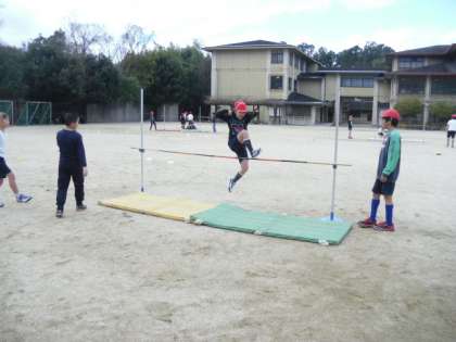 今日が最後の学習でした。4年生にとっては初めての種目ということもあり、初めはどちら側から踏み切るほうが跳びやすいのかも迷っている姿が見られていましたが、1時間ごとに安定したフォームで跳び越せるようになっていきました。それに連れて、記録も着実に伸ばしていくことができ、手ごたえや楽しさを味わうことができたようです。