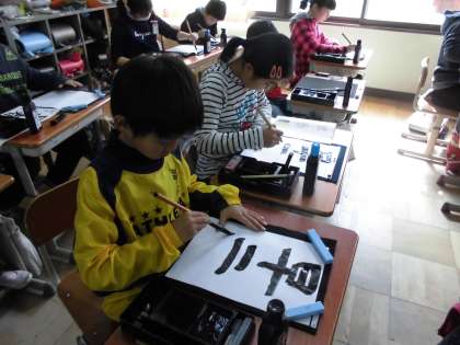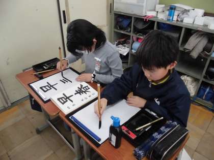 久しぶりに,習字の学習をしました。書いた字は「早春」です。いつもノートに書いている字とは違うせいもあり,自分の思い通りの字が書けるまで何度も書き直しをしている子が多かったです。納得の字が書けたときは,なんとも言えない満足感に満たされた表情の子どもたちでした。