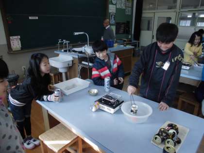 お忙しい中,ご参観下さり,ありがとうございました。理科では,1,2組ともに,「すがたをかえる水」の学習をしました。学習の始めの時間として,アルミ缶に氷を入れて温め,水につけると缶がつぶれる,という実験をしました。なぜそのような現象が起こったのかを,この学習を通して解決していく予定です。