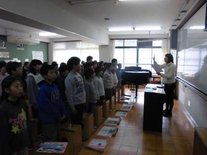 今日は,特別に6年生の音楽の先生に合唱の練習を見てもらいました。よりきれいな歌声になるために,たくさんのポイントを教えてもらうことができました。教えてもらったことを一生懸命取り入れようと頑張る子ども達。一番最初の合唱に比べ,授業の最後に歌った合唱は,とても素晴らしくて感動しました。卒業式,6年生に素敵な歌を届けたいと思います!