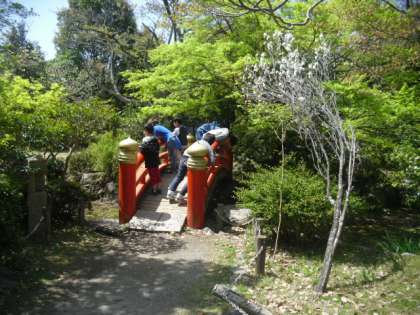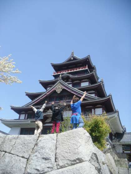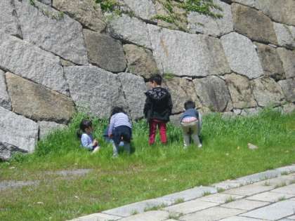 今日は、桃山城に探検に行きました。桜は、ほとんど散ってしまいましたが、新緑が美しかったです。陽だまりはとても暖かく、草むらではつい寝そべってしまいたくなりました。石垣をよじ上ってみたり、階段を滑って降りたりして、今日も楽しいひと時を過ごしました。