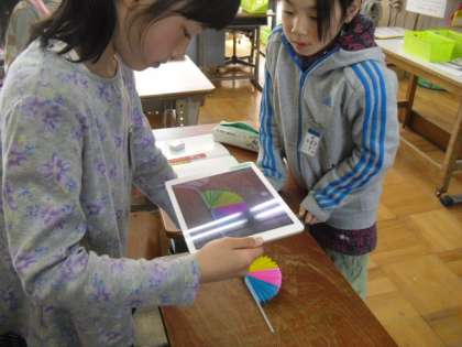 今日の算数は、色紙で作った扇を使っていろいろな開き方をし、そこから見つけたひみつを交流する学習をしました。交流するためにタブレットで写真を撮り、そこに気付きを書き込んでまとめたものを大型テレビにどんどん集めていきました。子ども達にとっては、初めての操作だったのですが、さすがにのみこみが早く、楽しんで取り組むことができていました。今日は結局そこまでで時間切れでした。来週は集まった画像を交流して整理していこうと思います。