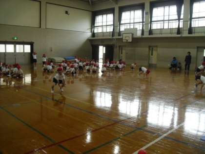 急遽,体育館での初めての体育になりました。走ったり,スキップしたり,くまになって四足で歩いたり,蛙のように飛んでみたり。みんな一生懸命でした。