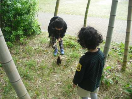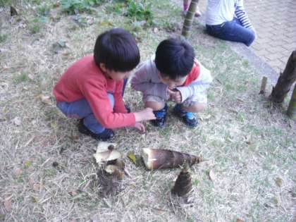 第2グランドの北端にある竹やぶで筍掘りをしました。例年、たくさんの筍が収穫できます。今年も、みんなで掘りました。スコップを使っても、なかなかうまく掘れません。みんなは、担任が掘り上げた筍を「重たい。」と、言いながら運んでくれました。次は、教室で皮むきに挑戦してもらいます。