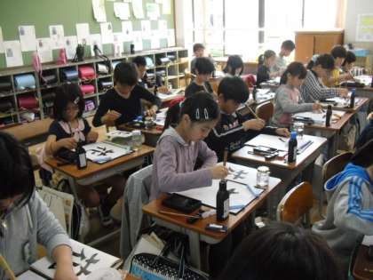 4年生最初の書写は「花」から始まりました。「横画」「はらい」「たて画」「曲がり」など3年生で習ったことを 振り返りながら書きました。
