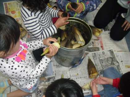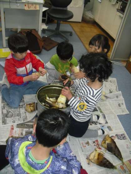 今日は、先日収穫した筍の皮を剥きました。大きな筍でも、皮をむくと驚くほど小さくなるのですが、子供たちは、皮をむく楽しさで、小さくなることに無頓着。しっかり皮を剥いてくれました。でも、だんだんと、動きが遅くなり、途中からは、指の先ばかりが気になるようでした。