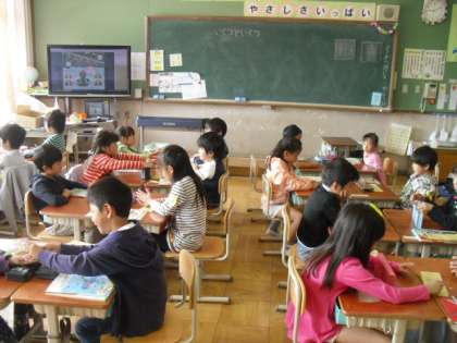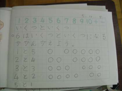 今日の算数の学習から「いくつといくつ」に入りました。最初に,6つのおはじきを使って「いくつといくつゲーム」をした後,6がいくつといくつになるかノートにまとめて書きました。初めてノートに書きました。