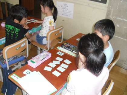 学習の最後に,1〜8の8枚のカードを裏向きに置いて,2枚めくって9を作る「9づくりゲーム」をしました。二人仲良く,楽しくゲームをすることができました。