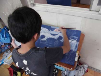 図工では,給食当番をしている姿を描いています。絵の具を使って,色混ぜをしながら自分オリジナルの色を工夫しながら作っていました。細かいところまで色を塗ろうと集中して取り組んでいました。一人ひとりの個性溢れる作品に仕上がってきているので,完成が楽しみですね。