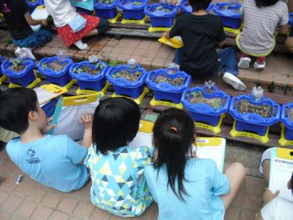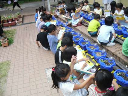 先週たねまきしたあさがおのめが出ました。ふたばのようすを観察し,カードに記録しました。形をよく見て葉の形を描き,色を塗りました。気付いたことなどコメントも書きました。