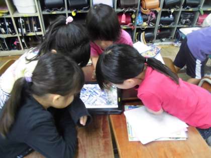 今日の社会科の時間、3年2組ではタブレット端末を使って、校区の特徴について調べていきました。航空写真を見て、田や畑の位置を把握し、地図に書き込んでいきました。