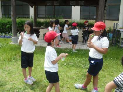今日は,たけのこ学級のみなさんに招待してもらって,シャボン玉やさんに参加しました。よく晴れていて,シャボン玉もとてもきれいに見えました。ハンガーやうちわなども使って,いろいろな大きさシャボン玉をとばしました。順番に譲り合いながら楽しむことができ,片づけまでばっちりでした。たけのこ学級のみなさん,お世話になり,ありがとうございました。