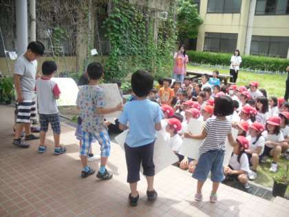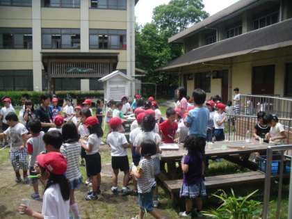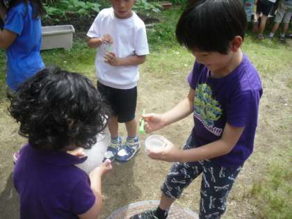 6日から、たけのこのシャボン玉屋さんがいよいよ始まりました。これは、たけのこのとっても大切な学習です。日ごろ、みんなの前で話すことなどないたけのこ学級の児童にとっては、大切な学習の機会です。まず、大きなシャボン玉液のつくり方をインターネットで調べ、実際に作って確かめます。そして、シャボン玉屋さんでのみんなへの注意を考え、お店屋さんでみんなの前で説明をします。お店が開店すれば、自分たちもシャボン玉をしたいのを我慢して「シャボン玉液は、いりませんか。」と、みんなの中を回ります。終われば、後片付けと、目の回る忙しさです。みんなの前で話す練習を何度もしましたが、1年生にとって初めての経験ですから、おそらく、恥ずかしくて声も出ないし、もしかするとできないかもしれないと思っていましたが、今まで、体育館にも入れず怖がっていた児童が、みんなの前で役割を果たしたのには、驚きました。これから、回を重ねるたびに、成長してくれることを期待しています。