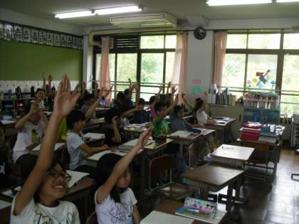 小数×小数の学習を進めている5年生。だんだん手を挙げる人の数が増えてきました。