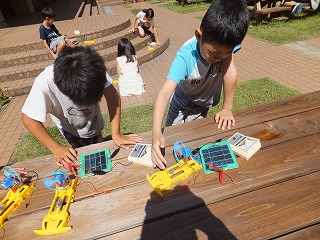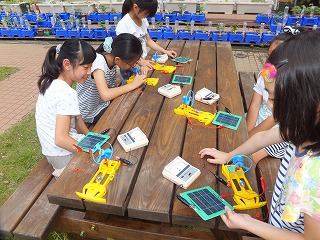 4年生は理科で「電池のはたらき」という学習をしています。直列つなぎと並列つなぎの違いをモーターを使ったり,検流計で電流を測ったりしながら調べてきました。今日は光電池を使ってモーターを回したり豆電球を光らせたりしました。光電池を太陽の方に向かるなど子ども達はいろいろな工夫をしていました。