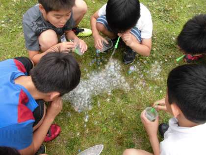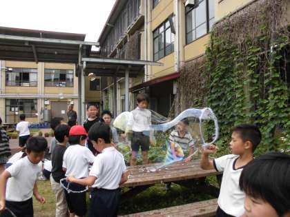 9日の中間休みに,たけのこ学級のシャボン玉屋さんに招待されました。大きいシャボン玉や小さいシャボン玉など,いろんな形のシャボン玉が用意されていたので,友達と協力して大きな作品を作ったり,工夫してシャボン玉を作ったりして,子どもたちも楽しんでいました。