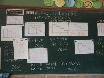 算数科では,複雑な形をした図形の面積を工夫して求めるという授業を行いました。