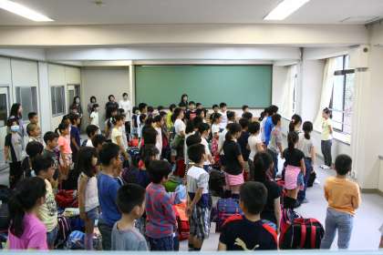グラウンドで行うはずの出発式でしたが、ぽつりぽつりと雨が落ち始めたので、多目的室に変更。蒸し暑い中での出発式でしたが、子どもたちは整然とした態度で臨んでいました。