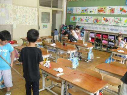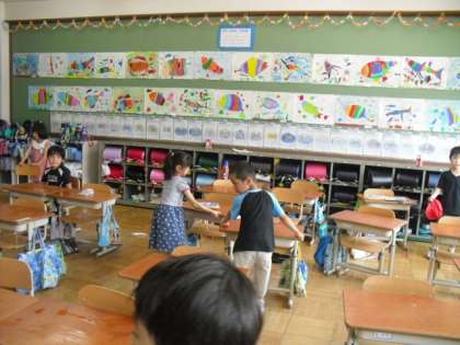 今週から,6年生にお手伝いをしてもらわず,1年生で掃除をしています。班ごとに分担を決めて,3〜4人で力を合わせて,がんばっています。いつもきれいな教室で学習できるよう,これからも掃除を頑張っていきたいと思います。