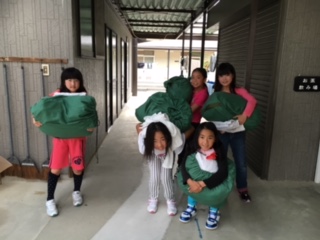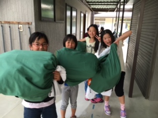 プレイホールで泊まるので、シュラフなどが入った袋を、一人ひとつ運んでいます。