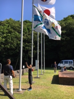 学校の旗を降ろし、このあとは船に乗って出発です。