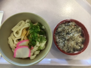 お昼は鳥羽水族館の中にあるレストランで、カツカレー、ラーメン、伊勢うどん、ハンバーグの中から選択して食べました。写真は伊勢うどんセット。
