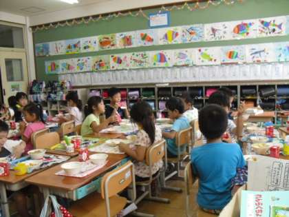 今日の給食はカレーでした。3・4校時の水泳学習の時に,プールまでカレーのよいにおいがしてきました。今日は,とても天気も良く,がんばってふしうきまでしたので,とてもおなかがすいていました。いただきますの後,もくもくと食べる姿が見られました。