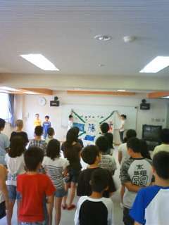 奥越青少年自然の家に到着しました。まず校歌を歌って旗揚げ、そして入所式です。