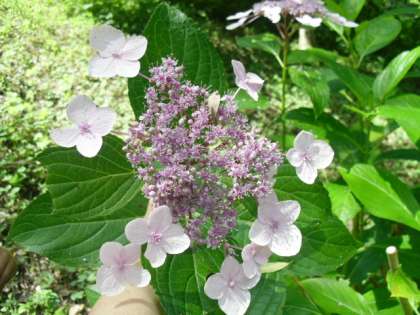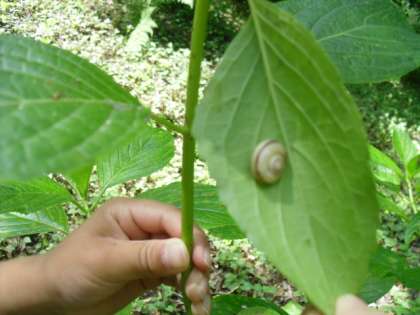 生き物もたくさん見つけられました。小さいバッタがたくさんいて必死で捕まえた子が何人かいました。アオスジアゲハが飛んでいました。あじさいの葉にカタツムリもいました。ひまわりもきれいに咲いていました。図工で描いているがくあじさいも咲いていました。