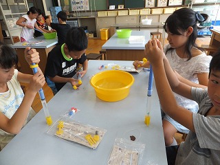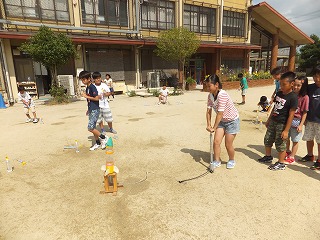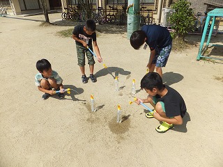とじこめた空気や水の性質を利用しておもちゃを作りました。噴水を使ったおもちゃでは力の入れ具合を工夫してうまくボールをキャッチしていました。水ロケットは飛び上がった高さに驚いていました。