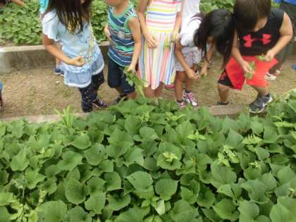 はじめに植えた時の小さな葉っぱが,子どもたちの顔の大きさくらいまで大きくなりました。