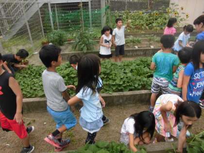 子どもたちは,サツマイモの苗をそっと手でどかし,雑草を抜きました。