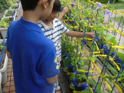 水やりする時に,つるがきちんと巻き付けるよう,お世話しています。