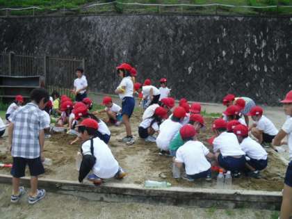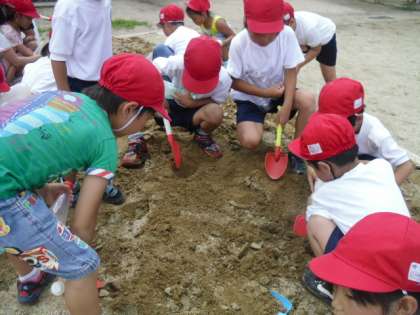 最後に,砂場に移動して,スコップなど使って山をつくったり,掘り起こしてみたりして楽しみました。泥だんごを作っている子もいました。遊んだあとの片づけも頑張ってできました。天気が良い中で,2時間楽しめました。