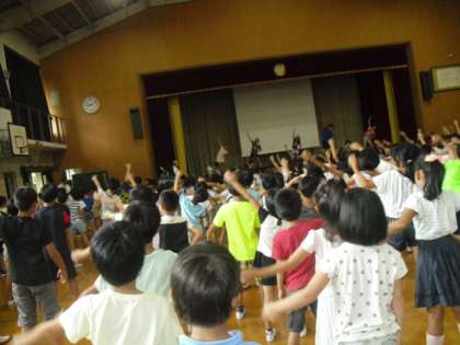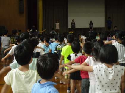 2年生のかめのこタイムの後,運動委員会の人が前に出て見本をしてくれて,ラジオ体操の練習がありました。夏休みにあるラジオ体操には積極的に参加して,一日のスタートを気持ちよく切れるようにしていけるといいですね。
