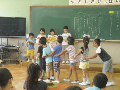 大きな声でみんなの方をみて発表するというめあてのもと,みんながんばりました。
