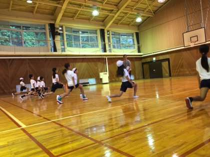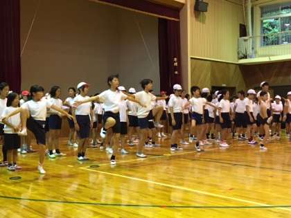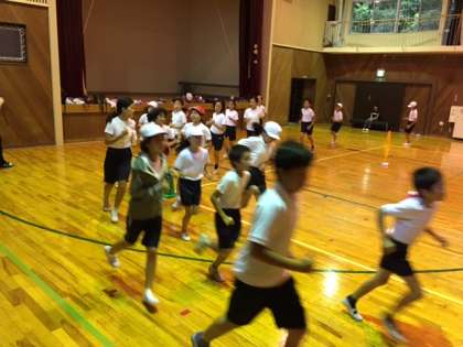 ほんとうならば、爽やかな緑の木々の中を走る予定でしたが、雨のために体育館での実施となりました。