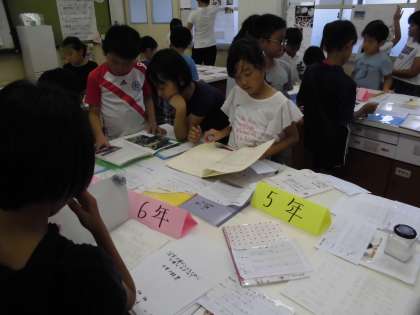 今日、夏休みの自由研究を見に行きました。高学年のみんなが一生懸命研究した作品や研究ノートを熱心に見ていました。