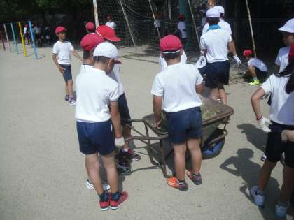 1・2時間目は玉入れ集会,さらに草ぬき&石ひろいでした。