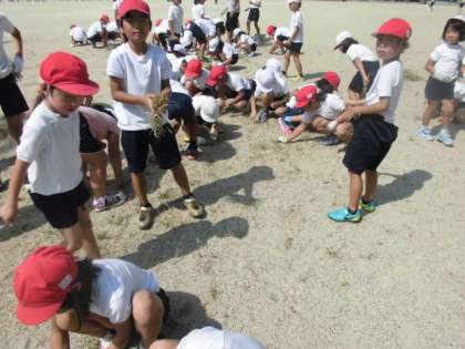 その後の草引きでは,運動場の草を抜いたり,大きめの石を拾ったりして,運動場をきれいにしました。