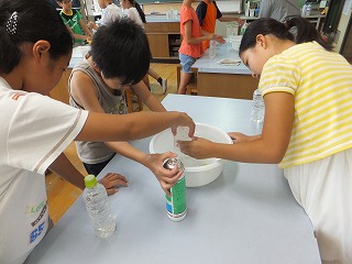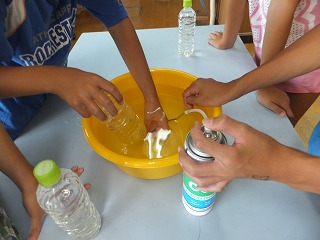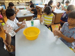 1人1本,ペットボトルを用意し,炭酸水作りをしました。まず,水を満タンにしたペットボトルに水上置換という方法で二酸化炭素を入れます。全員が準備できた後,ペットボトルを振ります。すると,水に二酸化炭素が溶け,溶けた分だけ体積が小さくなり,ペットボトルがへこんでしまいました。あっという間にへこんでしまうのでみんなびっくりしていました。