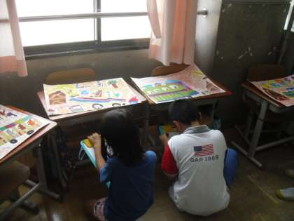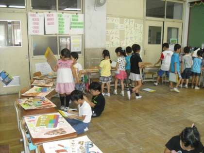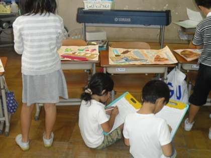 今日の図工は,お話の絵〜もぐらバス〜の鑑賞をしました。机を円形に並べ,全員の絵を見て回りながら,鑑賞し,鑑賞の記録を書きました。友達の絵のよいところをたくさんもつけられました。